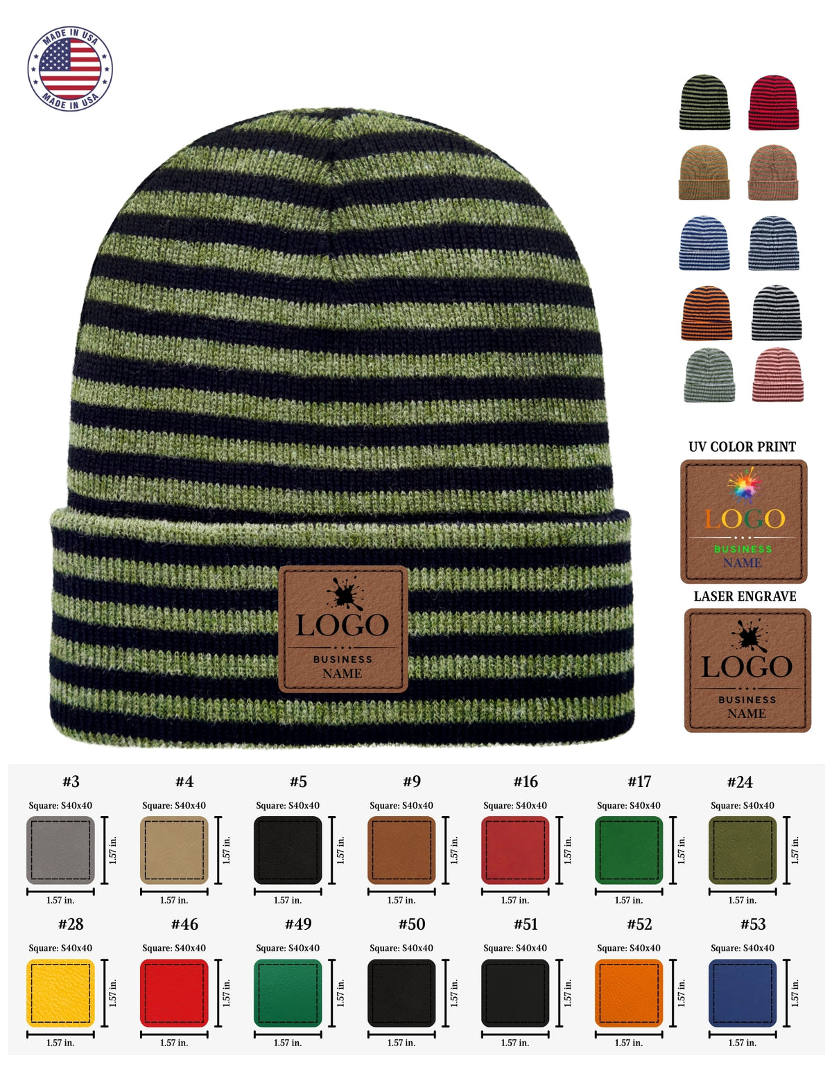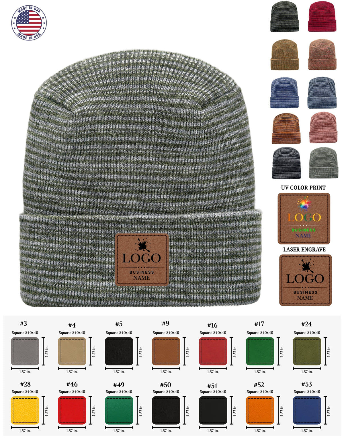 Our primary and most popular customization option is custom leatherette patches sewn directly onto our beanies. These patches are either laser engraved or UV color printed using high-end industrial printers to accurately match your logo colors.